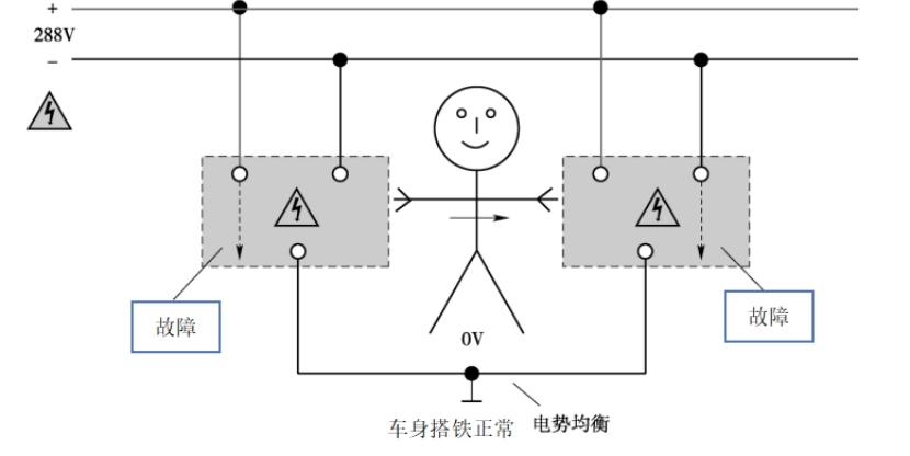 ? ? ? ?觸電情況:當(dāng)新能源汽車的高電壓部件發(fā)生對(duì)車身搭鐵故障時(shí),人體在同樣的情況下就有可能發(fā)生觸電事故。